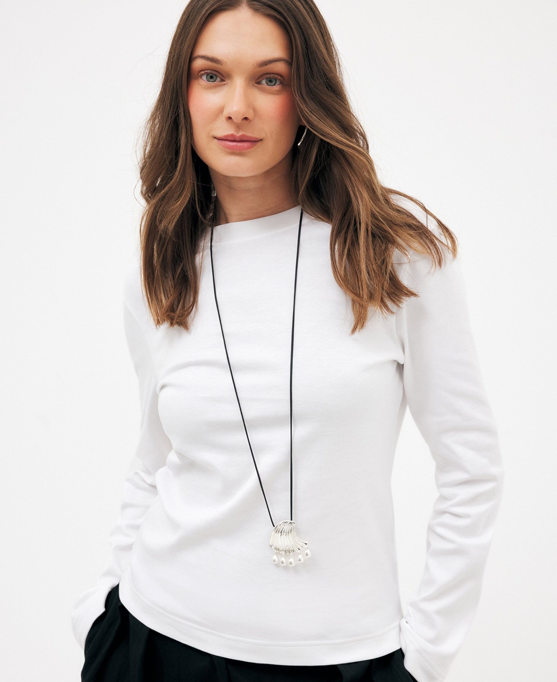 - Länger geschnittenes T-Shirt mit verlängertem Ärmel: Ein dezentes Upgrade mit großer Wirkung. Der längere Ärmel sorgt für mehr Eleganz und macht es perfekt für gehobene Everyday-Looks und Work-to-Weekend-Stylings.
