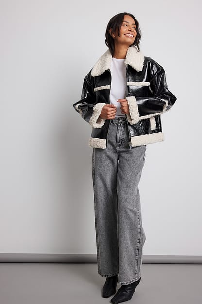 De jas is gemaakt van PU en heeft een klassieke kraag, scheve zijzakken, teddy details, een ritssluiting en een teddy voering. Deze jas komt in zwart.