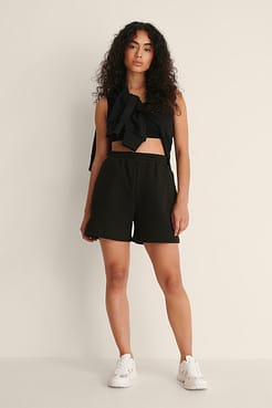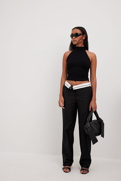 Het topje heeft een halternek, een geribbeld ontwerp en een lichte afgeknipte lengte. Dit topje komt in zwart.