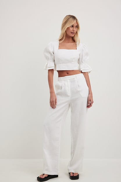 Denne toppen har en firkantet hals. Den har korte ermer med bølgete detaljer og 2 knappelukkinger på baksiden av nakken. Denne toppen har en åpen rygg med knytbare bånd og ei beskåret lengde. Denne toppen finnes i hvitt.