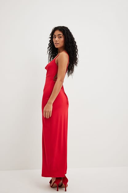 Denne kjolen har en drapert utringning. Den har skulderstropper og en design med åpen rygg. Denne kjolen har en midilengde og et stretchy materiale.