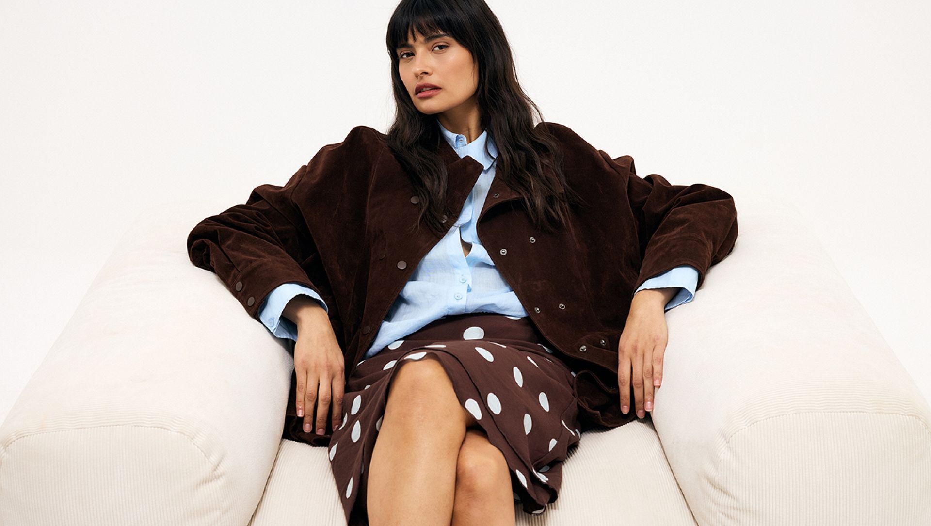 Kombinera en brun stickad tröja eller blazer med en ljusblå skjorta och en neutral kjol. Mixen av mjuka material och mer strukturerade plagg skapar en silhuett som känns balanserad och avslappnat elegant.