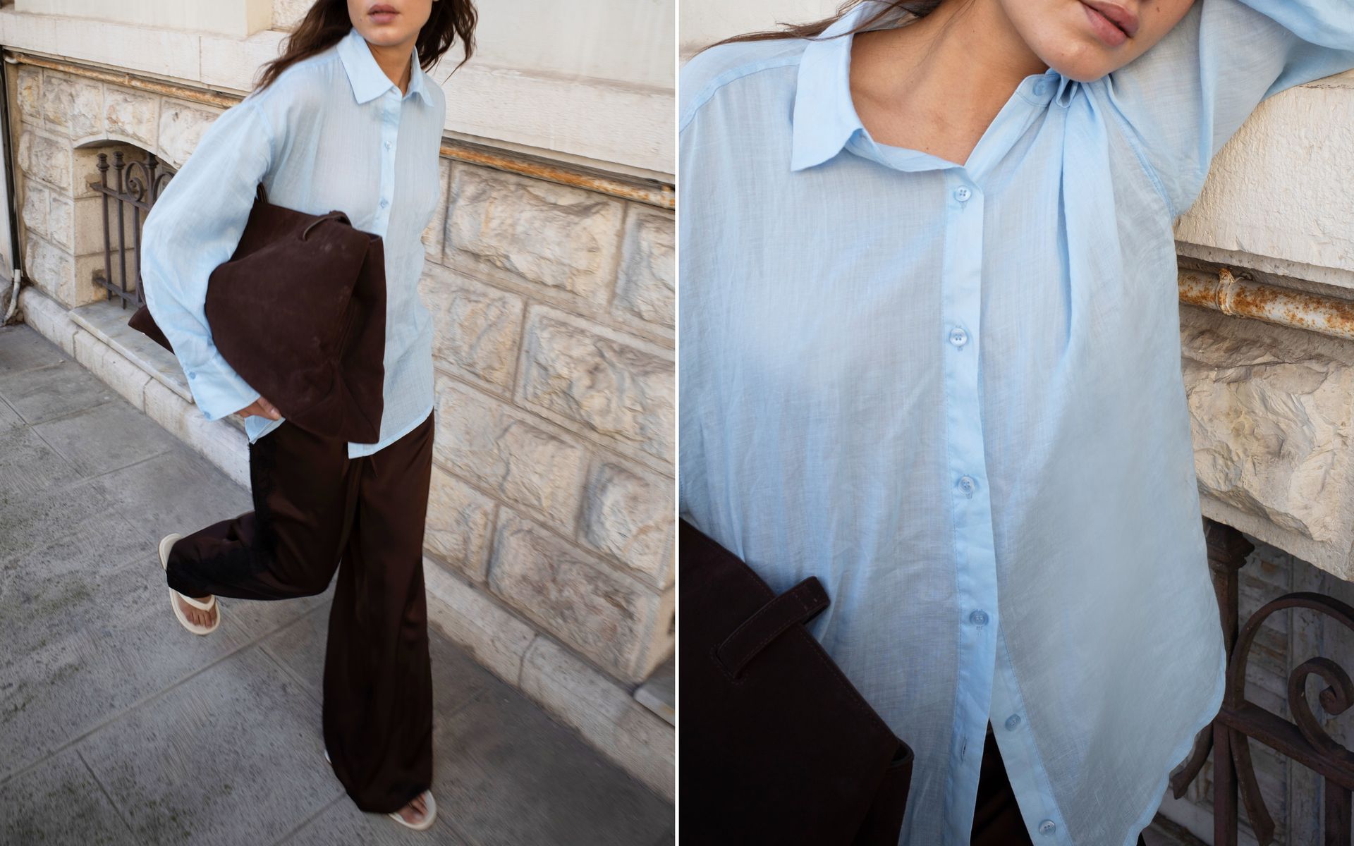 En strukturerad blå skjorta fungerar som grunden i looken. Oavsett om den är oversized eller mer figursydd tillför den klarhet och fräschör till de mörkare tonerna. Stylad tillsammans med bruna byxor eller kjolar skapar den en ren kontrast som känns både professionell och modern. För en mjukare stil kan något mer avslappnade silhuetter kombineras med tailoring eller texturerat stickat, vilket gör outfiten lika passande för kontoret som för vardagen.